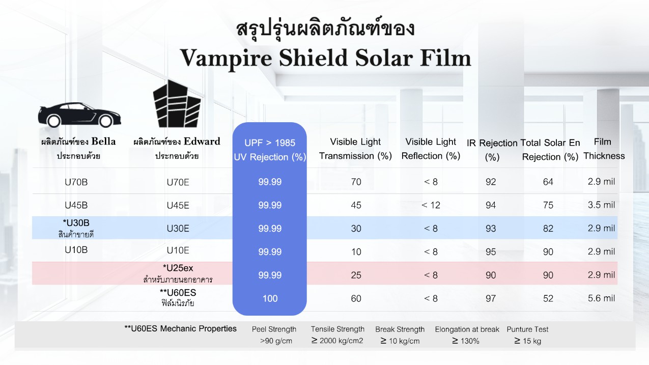 ในกรณีกระจกแตก เพราะเนื้อฟิล์มที่หนาและเหนียวจึงสามารถยึดกระจกที่แตกไม่ให้กระจายออกเป็นเสี่ยงๆ ซึ่งจะช่วยป้องกันการได้รับอันตรายจากการโดนกระจกบาดได้เป็นอย่างดีฟิล์มกรองแสง Vampire Shield - Bella Seriesเป็นฟิล์มกรองแสงสำหรับรถยนต์ที่สามารถป้องกันรังสี UV ได้ 100% ไม่ว่าจะเป็นรังสี UVA, UVB หรือ UVC รวมทั้งมีฉนวนกันความร้อนที่ช่วยป้องกันความร้อนได้สูงสุด จึงเป็นฟิล์มกรองแสงที่ดีที่สุดและประหยัดพลังงาน